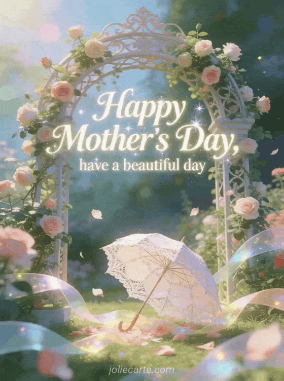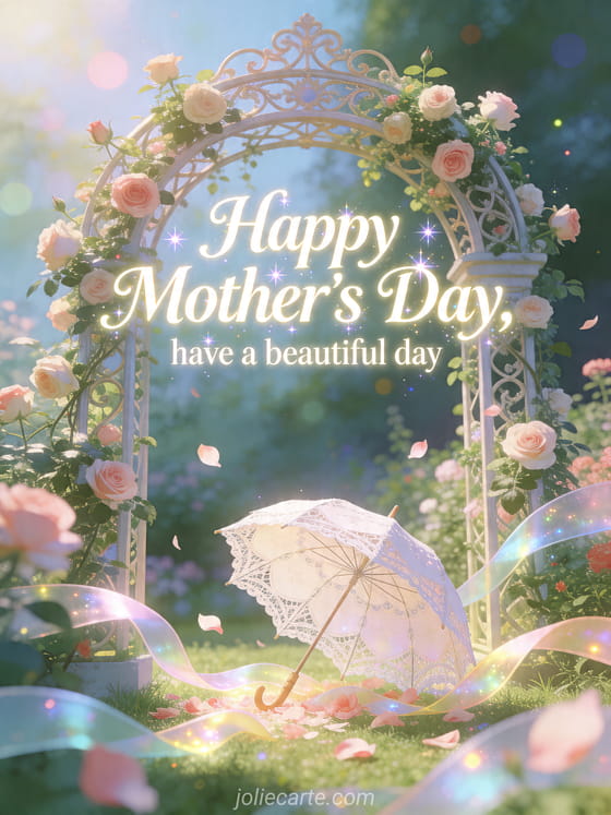 Offer a beautiful Mother's Day moment with a graceful illustrated garden arch, old roses, floating petals and festive ribbons. Discover also messages for Mother's Day, a handmade Mother's Day card or Mother's Day poetry kisses.