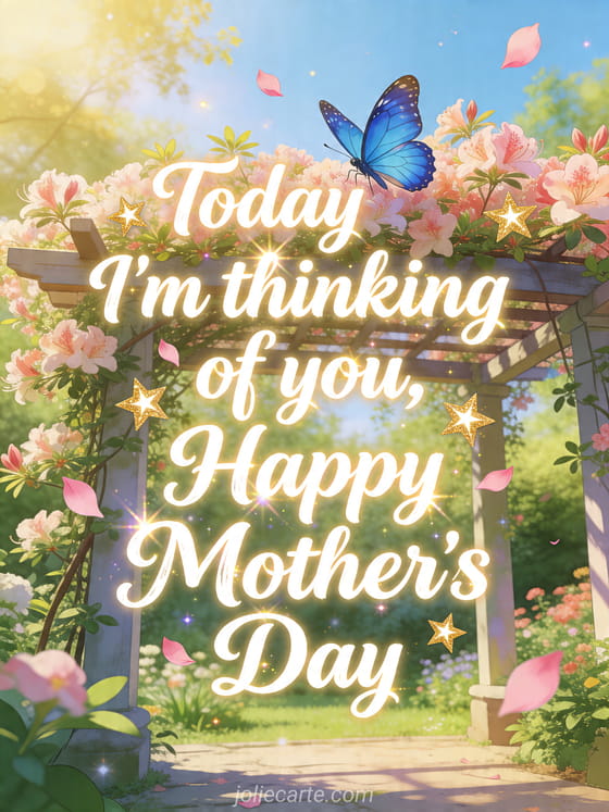 Share a bright Mother's Day card with airy ivory lettering, golden stars, pink petals, a blue morpho butterfly, and an azalea-covered pergola in a spring garden. Discover also beautiful Happy Mother's Day phrase for a mom, a Mother's Day poetic verse, or odes for Mother's Day.