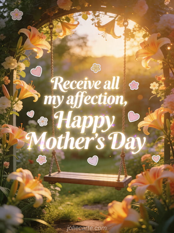 Share a serene Mother's Day greeting with a garden swing framed by glowing daylily, tiny blossoms and pastel hearts in warm afternoon light. You can also send poems for Mother's Day, Mother's Day poems or a Mother's Day pun.