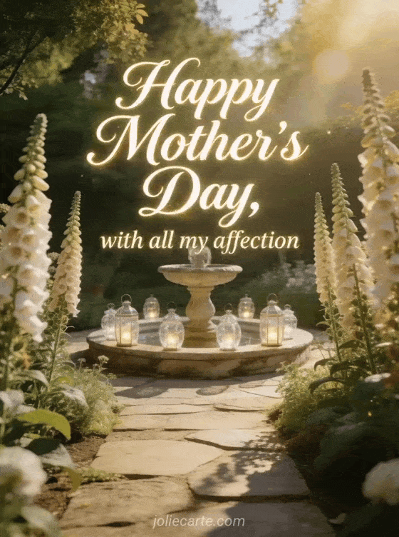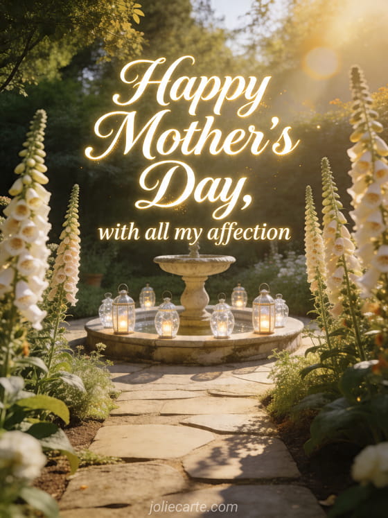 Share Mother's Day poetry on an elegant card with a sunlit garden path, tall foxgloves, a stone fountain, and crystal lanterns. Discover also a Mother's Day compliment, how to wish your mom a happy Mother's Day, or a Mother's Day card.