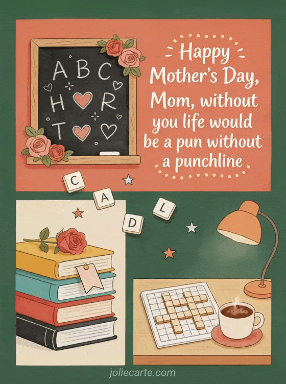 Share a witty Mother's Day collage with a chalkboard, books, roses, a crossword puzzle, hot chocolate and playful letter tiles. You can also send happy Mother's Day my daughter-in-law, happy Mother's Day or Mother's Day.