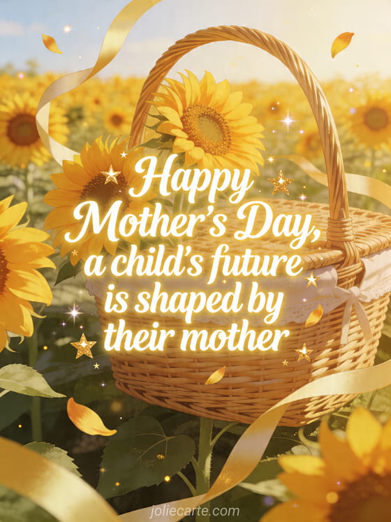 Share Mother's Day quotes on a radiant illustrated card with golden sunflowers, a woven picnic basket, fluttering ribbons, tiny stars, and sunflower petals. Discover also happy Mother's Day to my aunt, text about Mother's Day, or a message for Mother's Day.