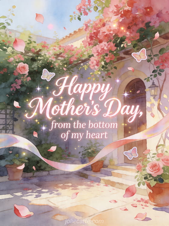 Share a Mother's Day rhyme with airy blush script, rose petals, little butterflies, and a bright courtyard wrapped in bougainvillea. A silk ribbon dances in the breeze on this moving hand-painted card from the bottom of the heart. Discover also love poem for Mother's Day, Happy Mother's Day deceased mom, or quotes for Mother's Day.