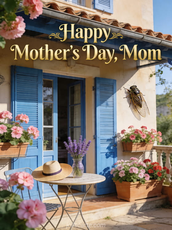 Celebrate Mom with a sunny Provençal veranda, blue shutters, pink geraniums, lavender on a round table and Mediterranean light. You can also send Mother's Day drawings, Mother's Day images or a Mother's Day drawing.