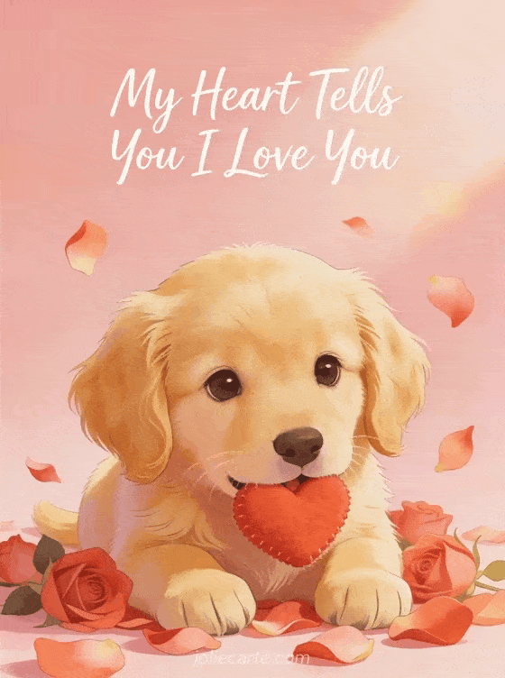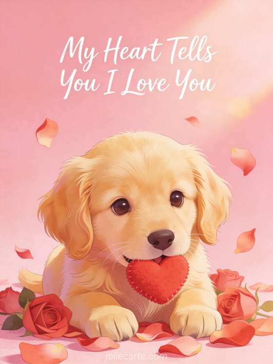 Send this adorable illustration card with a golden retriever puppy to express your love. Discover also a couple in love I love you gif or an I love you gif.