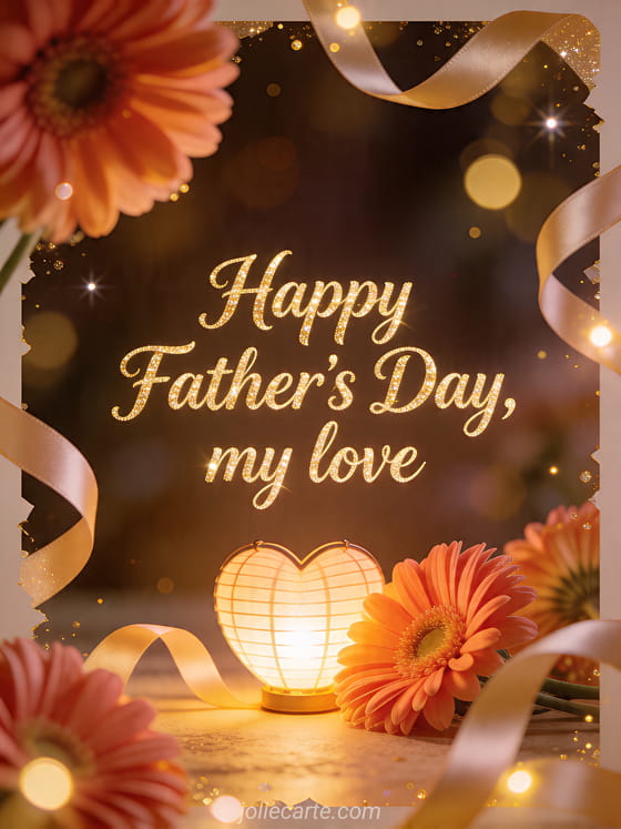 Send a romantic happy Father's Day my love greeting with a photorealistic heart-shaped lantern glowing beside coral gerbera flowers, satin ribbon curls and sparkling bokeh. Discover also an original Father's Day gif, best father's day or a personalized Father's Day card.