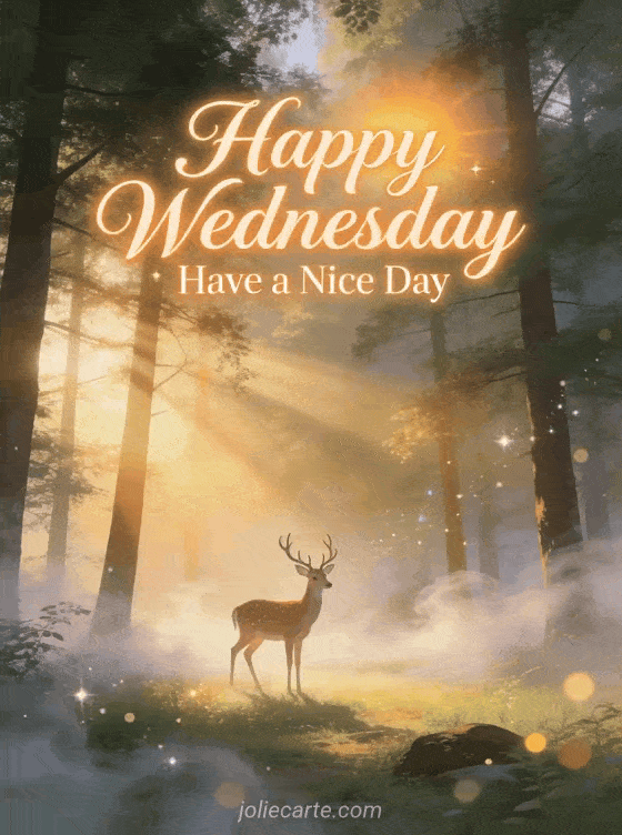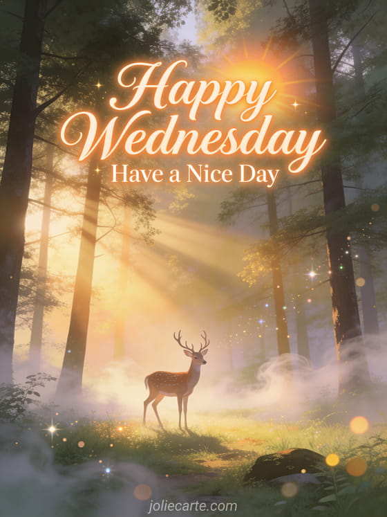 Share a warm happy Wednesday wish with this enchanting card featuring a majestic deer in a misty forest. Also discover a wednesday kisses images or a good morning happy wednesday coffee for more mid-week inspiration.