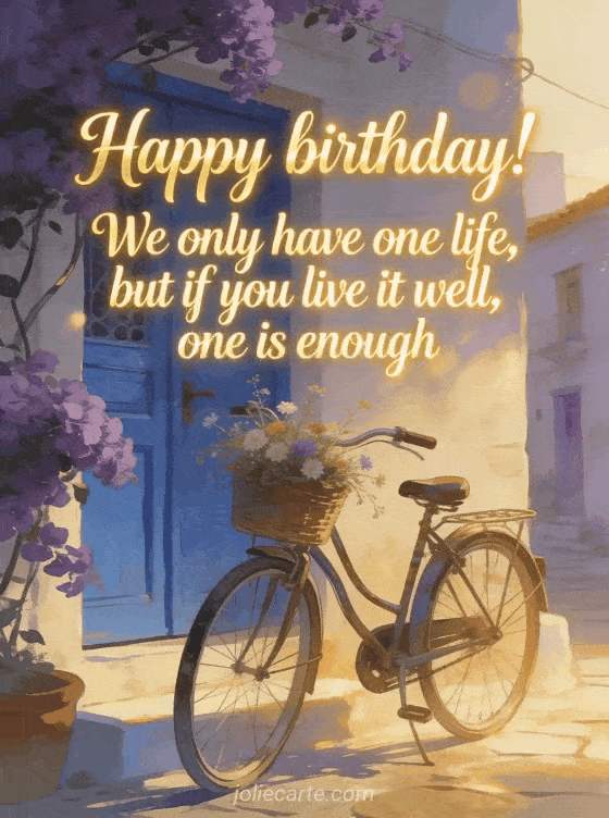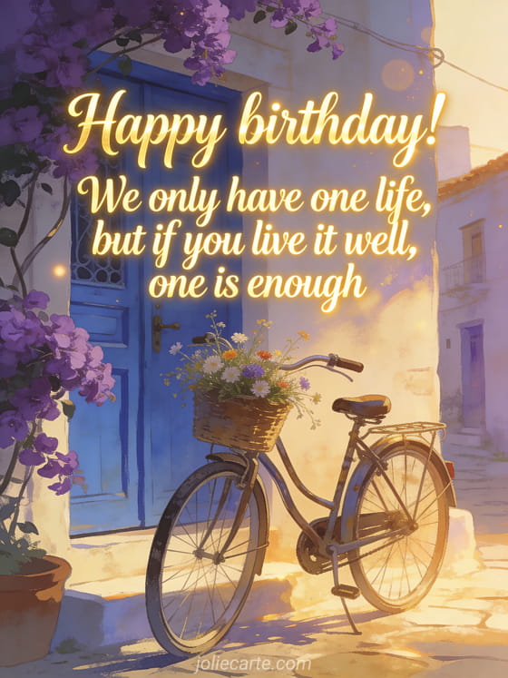 Share a nice happy birthday message with this charming design of a vintage bicycle, wildflowers, a blue village door, and bougainvillea in golden-hour light. You can also discover original birthday phrase, free original virtual birthday card, and original birthday card.
