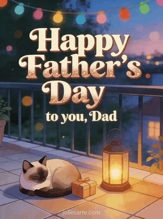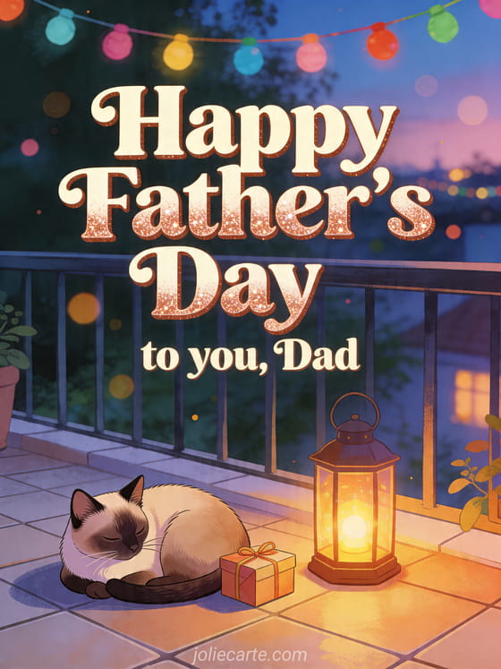 Send Dad a cheerful illustrated card with a Siamese cat curled beside a small gift and a glowing lantern on a tiled terrace. The warm evening colors make this Father's Day greeting feel tender and festive. Discover also happy Father's Day, my love happy Father's Day or a free father's day greeting card.