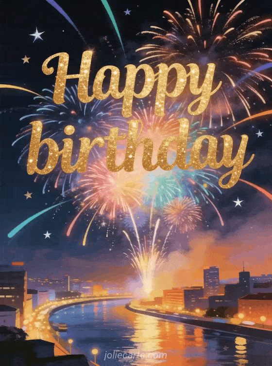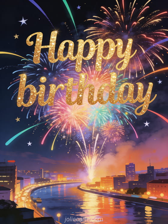 Celebrate a spectacular birthday with this stunning card featuring colorful fireworks over an illuminated city at night. Discover also a birthday card with mountain landscape or a birthday enjoy every moment card or a birthday nothing but happiness card.
