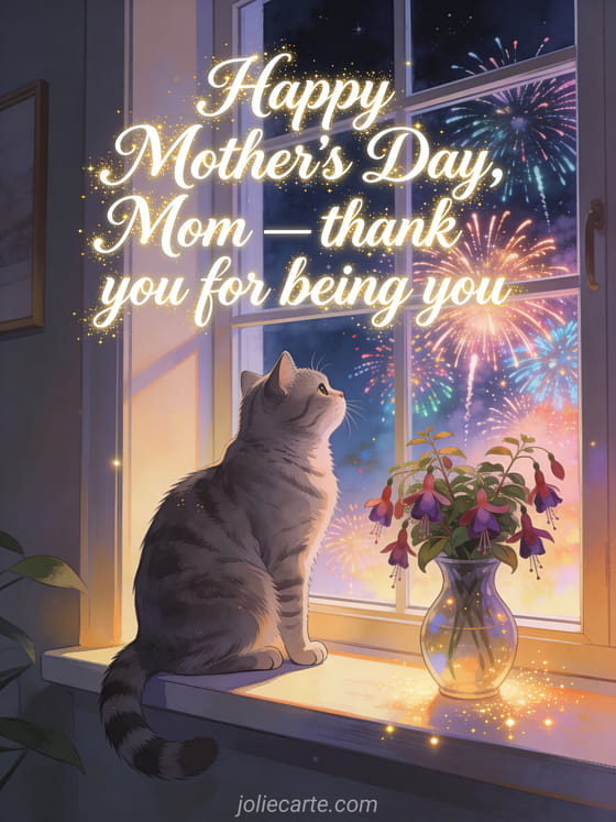 Surprise her with this magical original mother's day card. A grey British Shorthair cat sits on a windowsill watching spectacular fireworks through the window, with a vase of fuchsias and warm golden sparkles. Discover also a mother's day card mom or a free mother's day card.