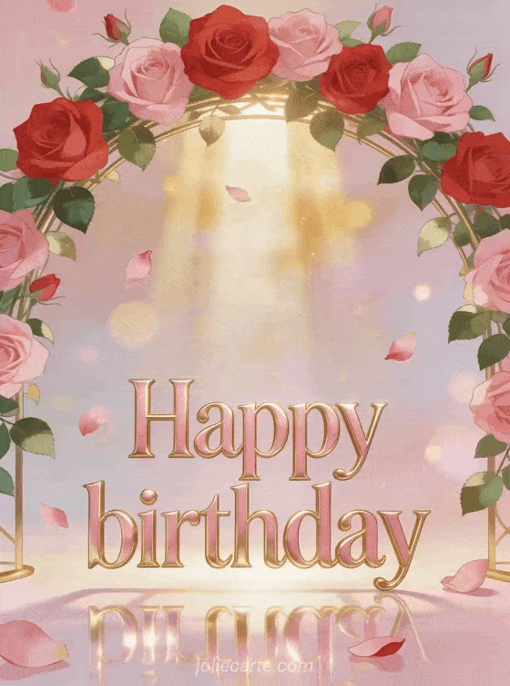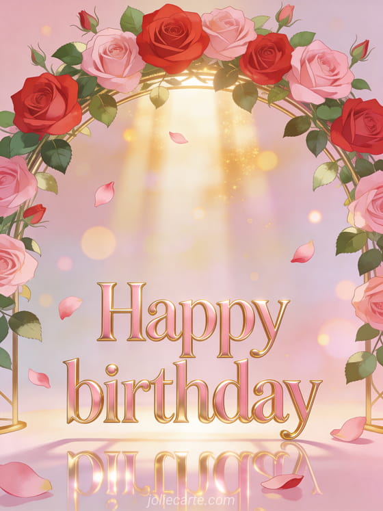 Send a romantic happy birthday with this refined card featuring an arch of red and pink roses with floating petals and golden light. Discover also a birthday card with kitten or a birthday card with ginger cat or a birthday fireworks card.
