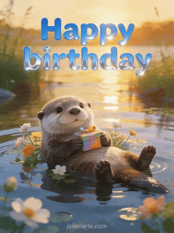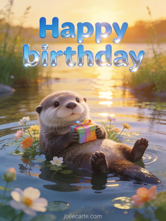 Brighten someone's birthday with this charming card showing a cute otter floating on a calm river, holding a colorful gift, bathed in golden sunset light. Also discover a birthday card with golden letters and fireworks or a minimalist birthday ecard.