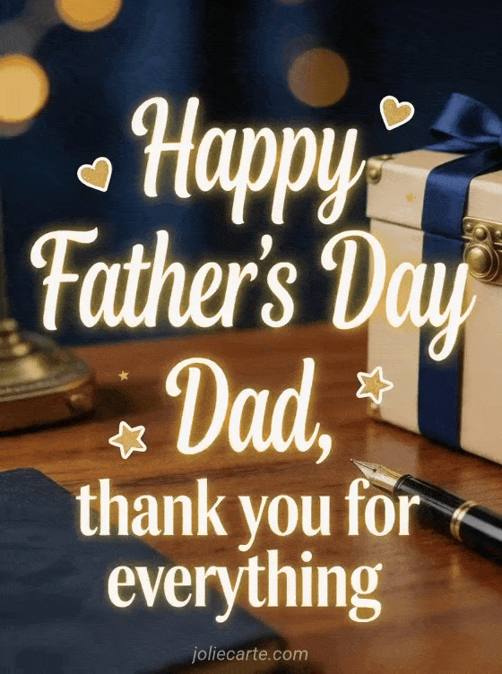 Send a personalized Father's Day card with cream calligraphic lettering, tiny heart and star stickers, a polished wooden desk, fountain pen, sealed gift box, brass accents and a deep blue ribbon. Discover also an easy Father's Day card, a father's day card design or happy father's day to my son.