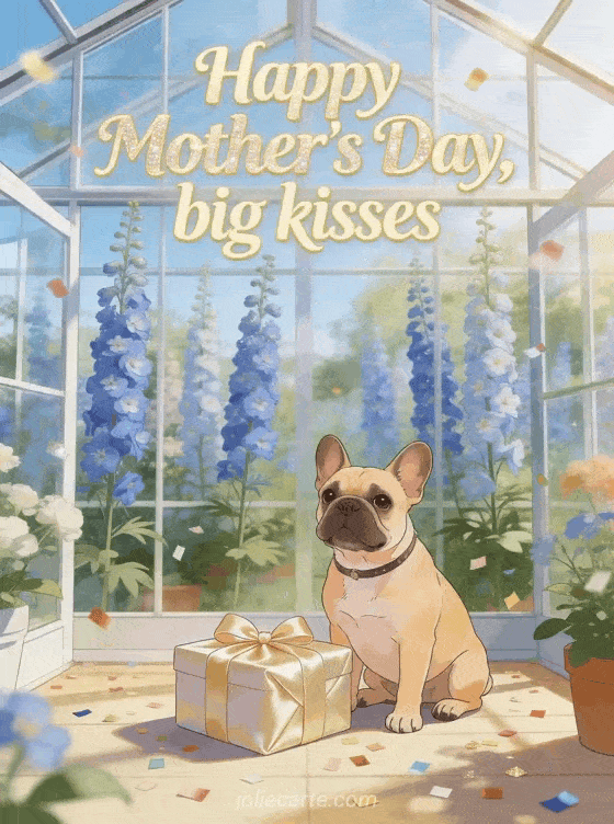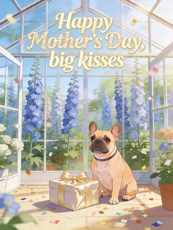 Share a photo for Mother's Day with warm cream lettering, subtle glitter, and a bright greenhouse filled with tall delphiniums. A French bulldog sits beside a satin gift box and scattered confetti in this joyful celebratory card. Discover also rhymes for Mother's Day, kind words for Mother's Day, or Mother's Day happy pictures.