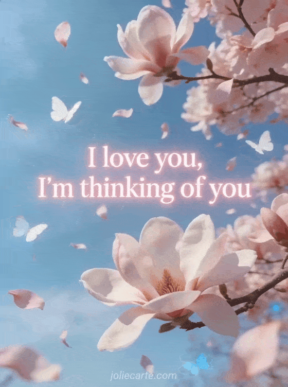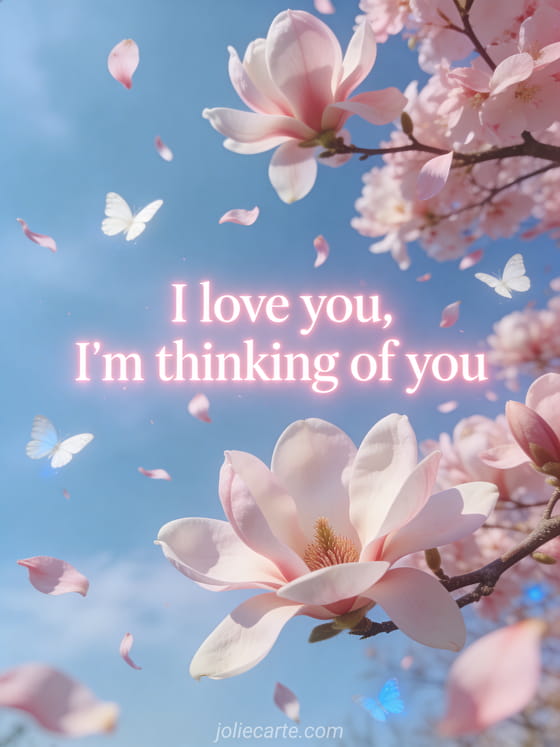 Send this romantic card with the words I love you, I'm thinking of you written in pink glowing letters, with a blooming magnolia and pale pink petals falling like gentle rain under a soft spring sky. Discover also a thinking of you kisses images or a thinking of you baby card.