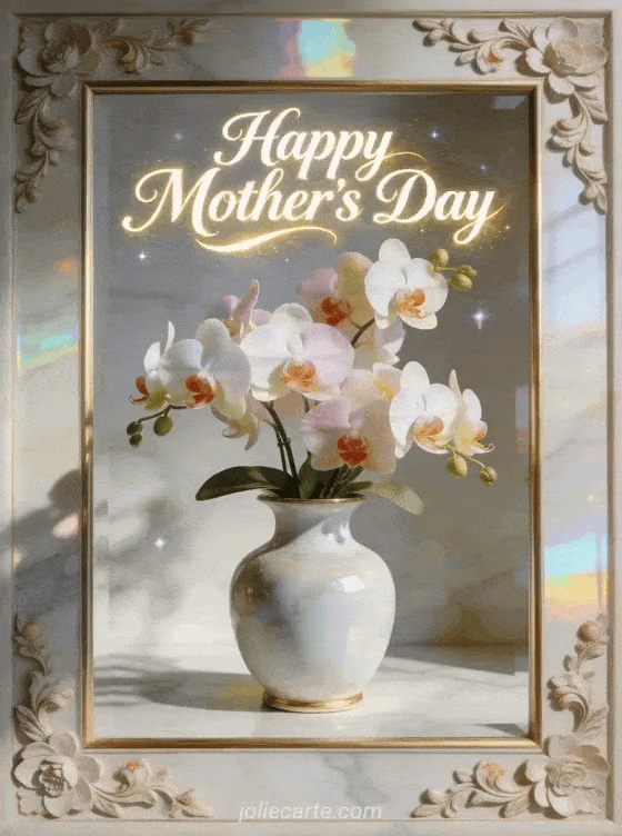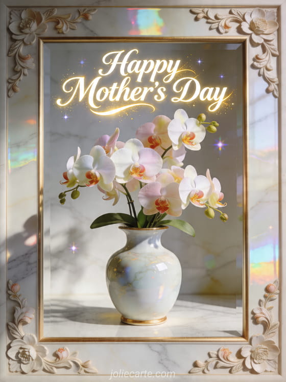 Share a refined Mother's Day card with a porcelain vase, radiant orchids, marble reflections and a graceful festive glow. Discover also sweet words for Mother's Day, a drawing for Mother's Day or a Happy Mother's Day card.