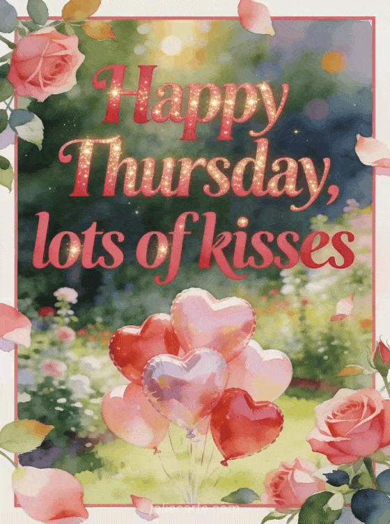 Share happy Thursday, lots of kisses with rose red lettering, heart-shaped balloons in a bright garden clearing, rose blooms and petals crossing the border. Discover also beautiful images for happy Thursday, sunny happy thursday image or images for happy Thursday.