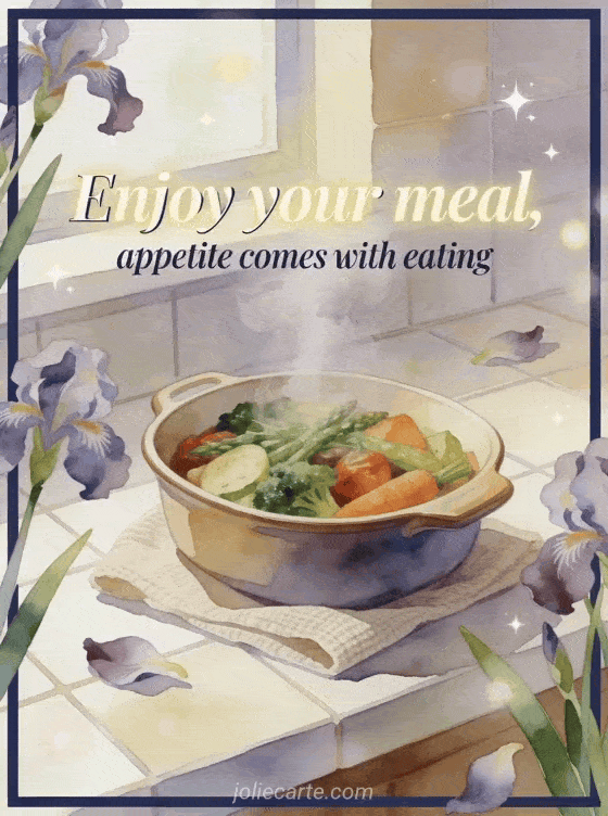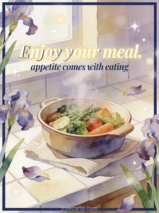 Share a homely meal wish with navy calligraphy, a steaming ceramic casserole, garden vegetables, a linen napkin and iris petals. Discover also a text to wish bon appetit, a quote to wish enjoy your meal or an enjoy your meal everyone image.