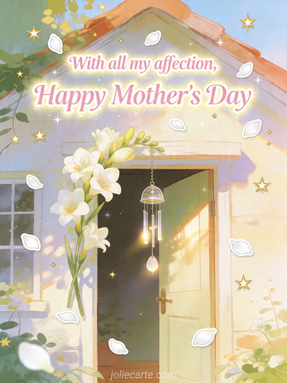 Share a welcoming Mother's Day card with a cottage doorway, fresh freesia, a delicate wind chime, white petals and tiny golden stars. Discover also a Mother's Day rhyme, a love poem for Mother's Day or Happy Mother's Day deceased mom.