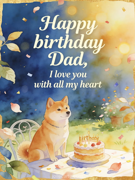 Send a poem for dad for his birthday with elegant cream lettering, a Shiba Inu beside a birthday cake on a sunlit garden table, and petals, leaves and confetti spilling over the border. Discover also a happy birthday dad I love you gif, a happy birthday dad birthday card or a birthday letter for his dad.