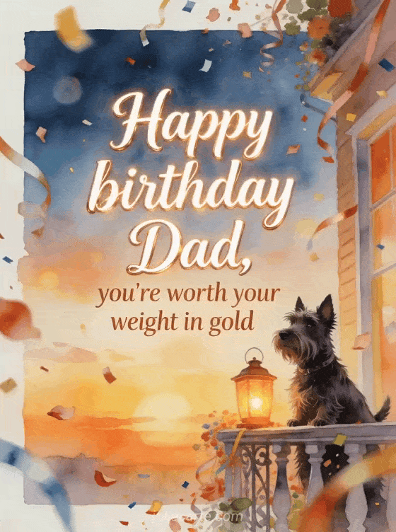 Send a poem for his dad for his birthday with luminous ivory script, a Scottish terrier beside a glowing lantern on a festive balcony, and petals, streamers and confetti over the border. Discover also a free dad birthday poem, a poem for dad for his birthday or a happy birthday dad I love you gif.