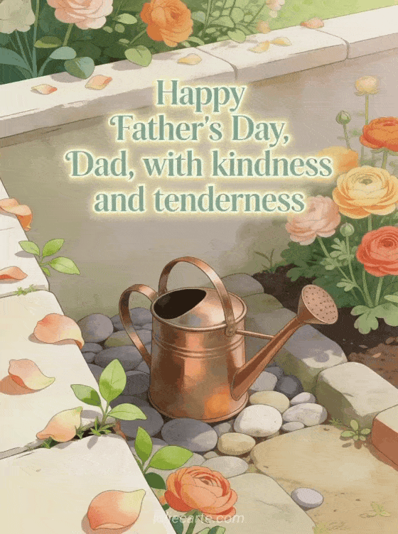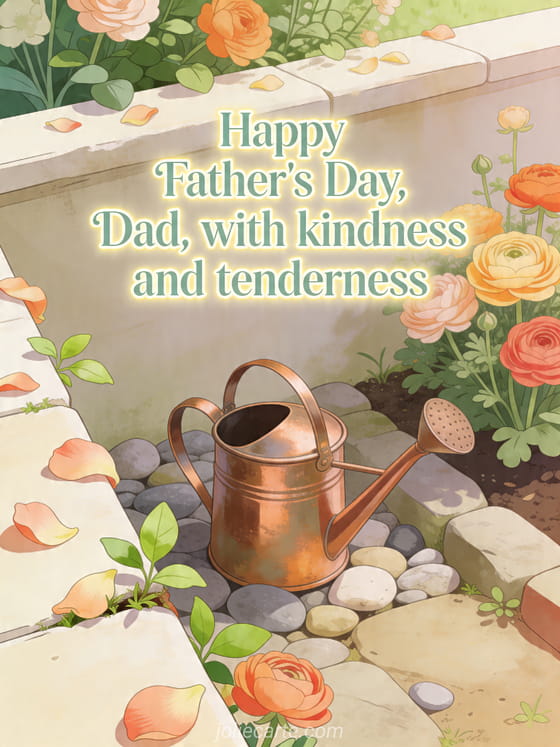 Send a tender happy Father's Day Dad poem with an illustrated garden corner, a copper watering can, smooth stones, layered ranunculus flowers and fresh leaves in a calm joyful palette. Discover also happy father's day dad drawing, a Dad Father's Day card or a free Father's Day card.