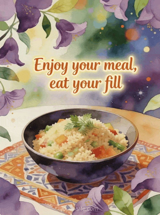 Share a warm enjoy your meal card with a deep bowl of couscous, vegetables, herbs and violet petals on a patterned table mat. Discover also a bon appetit animated smiley, an enjoy your meal my love poem or enjoy your meal kisses.