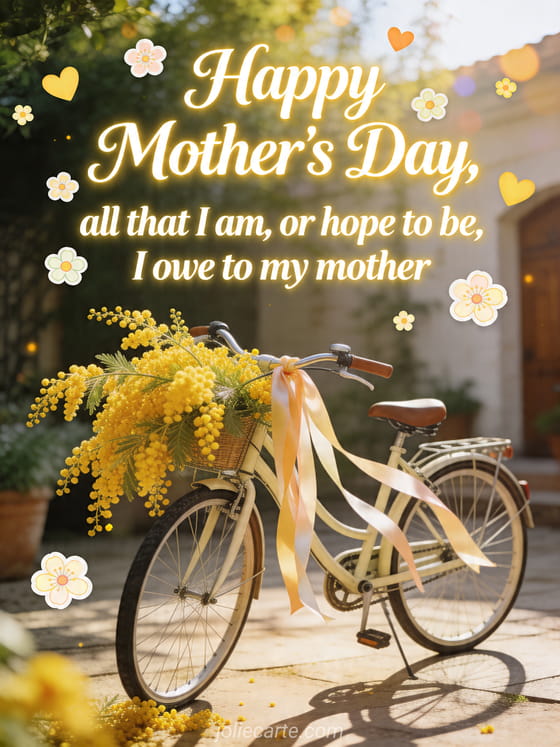 Share a radiant Mother's Day card with a sunlit courtyard, mimosa branches, a vintage bicycle and silk ribbons. You can also send Mother's Day poems, a Mother's Day pun or happy Mother's Day my daughter-in-law.
