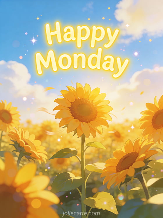 Brighten someone's Monday with this cheerful greeting card Happy Monday featuring a happy sunflower field under a blue sky with fluffy clouds. Discover also a start of the week card, a Monday gif card or a happy Monday card.
