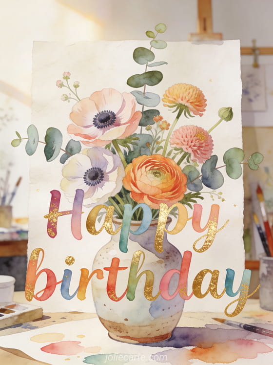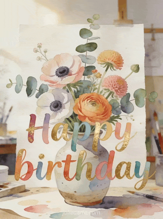 Celebrate with a pretty free animated birthday card featuring watercolor text, anemones, ranunculus, and eucalyptus in an artist studio style. Discover also anime birthday card, animated image happy birthday, and birthday animated.