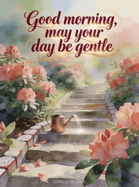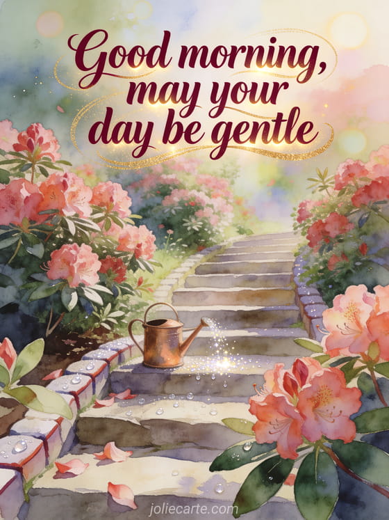 Send a peaceful pretty good morning message with warm burgundy watercolor lettering, a rhododendron-lined garden stairway, a small copper watering can and sparkling dew on stone. Discover also cute good morning message with tenderness in the morning, good morning message for her or floral good morning card.