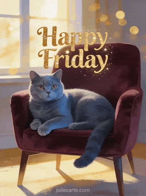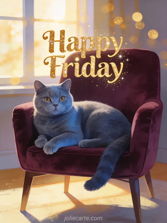 Send a pretty happy Friday greeting with golden lettering, warm afternoon light and a blue-gray Chartreux cat on a burgundy velvet armchair. Discover also good morning happy Friday beach, funny image funny image happy Friday humor or happy friday heart.