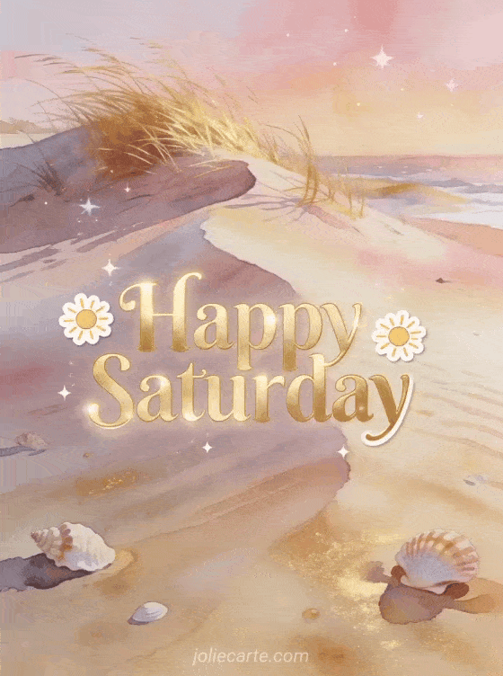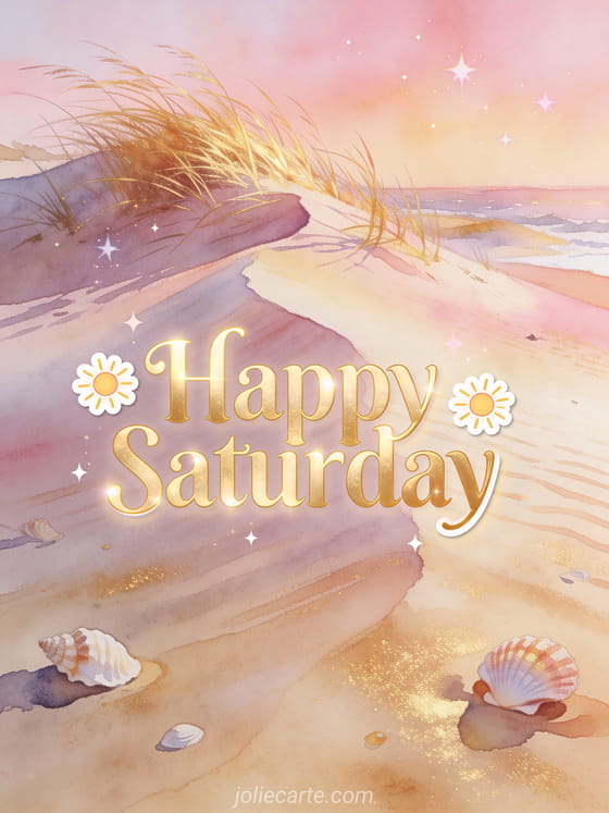Send a pretty Happy Saturday card with elegant golden letters, tiny suns, seashells and a wild beach where wind-shaped dunes glow in pink morning light. Discover also a hello saturday landscape, a have a good Saturday or a happy Saturday big kisses.