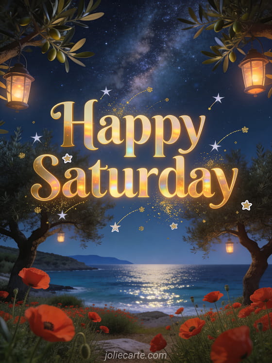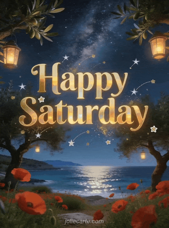 Send a pretty Happy Saturday card with golden letters, shooting stars, golden dust and a magical Greek olive grove with red poppies, lanterns, a view of the Aegean Sea and the Milky Way above the trees. Discover also beautiful animated happy Saturday image, good morning happy saturday nice day or happy Saturday and good weekend kisses.