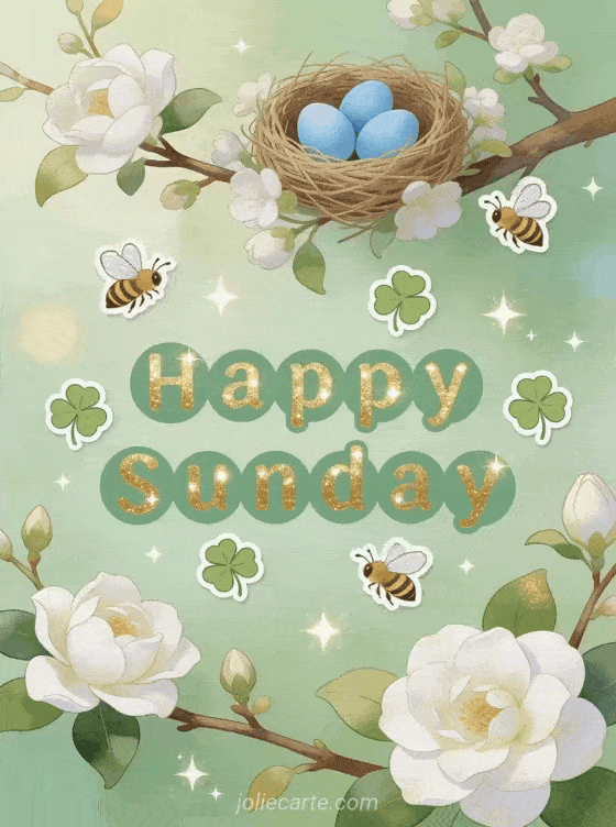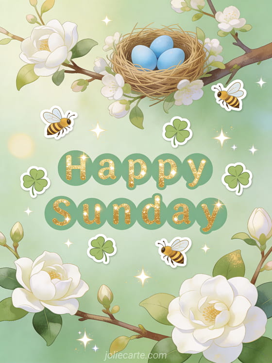 Share a gentle happy sunday card with sage green lettering, golden touches, cheerful bees, lucky clovers and a cozy bird nest among fragrant white gardenias. You can also send a happy sunday in the rain humor card, a little happy sunday message or an image to wish a happy sunday.