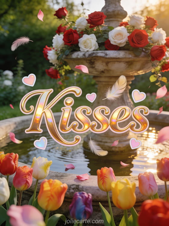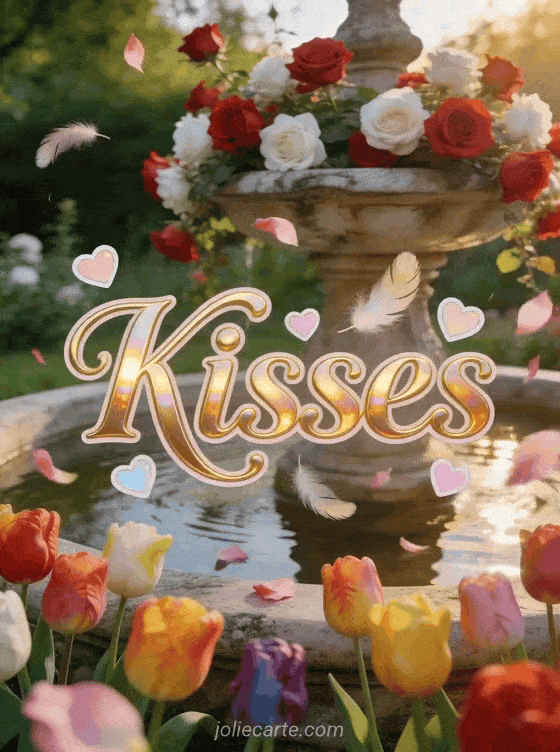 Share sweet kisses with this gorgeous garden-themed greeting card full of roses and tulips. You might also enjoy fish kisses gif or a sending kisses card for more loving greetings.
