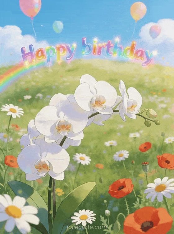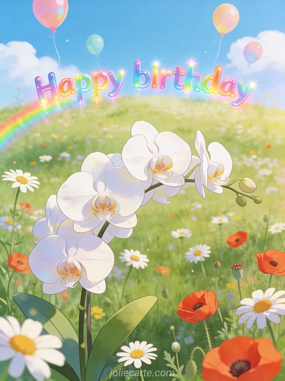 Share a pretty virtual birthday card child with white orchids in a blooming meadow of daisies and poppies, colorful balloons rising into a blue sky, and warm spring light. You can also discover cyber birthday cards child, free birthday card child, and happy birthday baby banner.