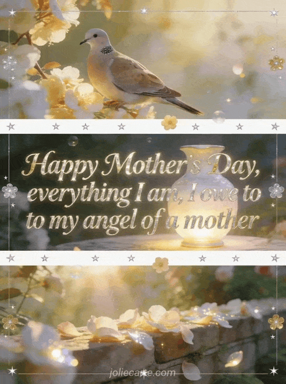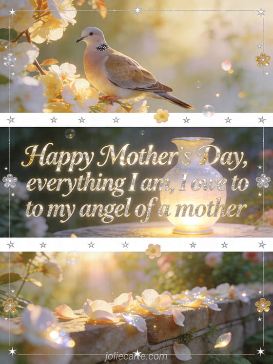 Share a quote for Mother's Day on a refined realistic card with a turtledove among bright blossoms, a glowing porcelain vase, sparkling petals, and a sunlit garden wall. Discover also free Mother's Day pictures, a poem for Mother's Day, or Happy Mother's Day messages.
