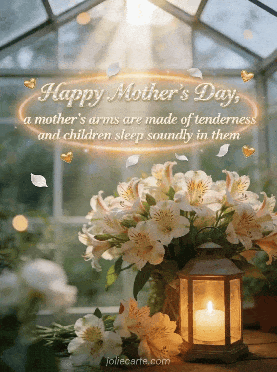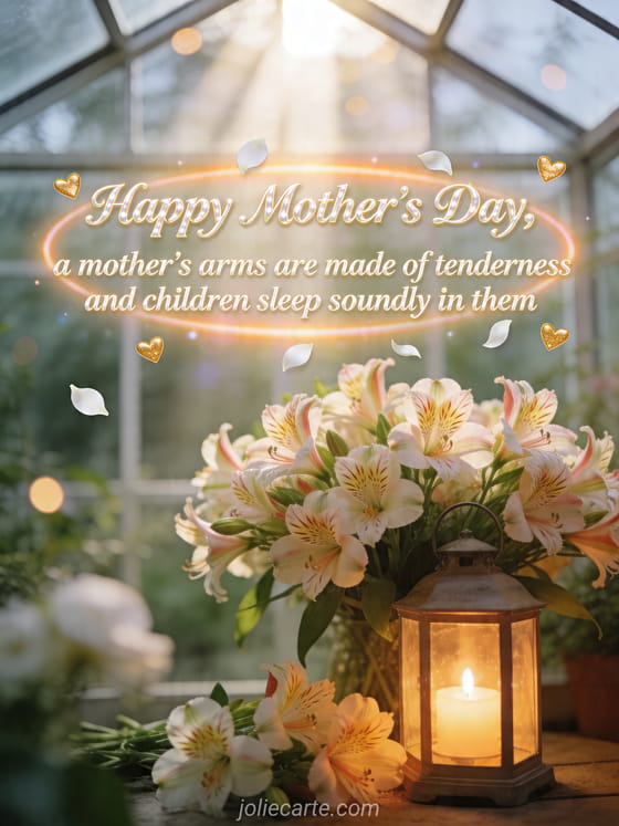 Share a tender Mother's Day card with pearl script, white petals, golden hearts, alstroemeria, and a glowing candle lantern in a bright glasshouse. Discover also a quote for Mother's Day, free Mother's Day pictures, or a poem for Mother's Day.