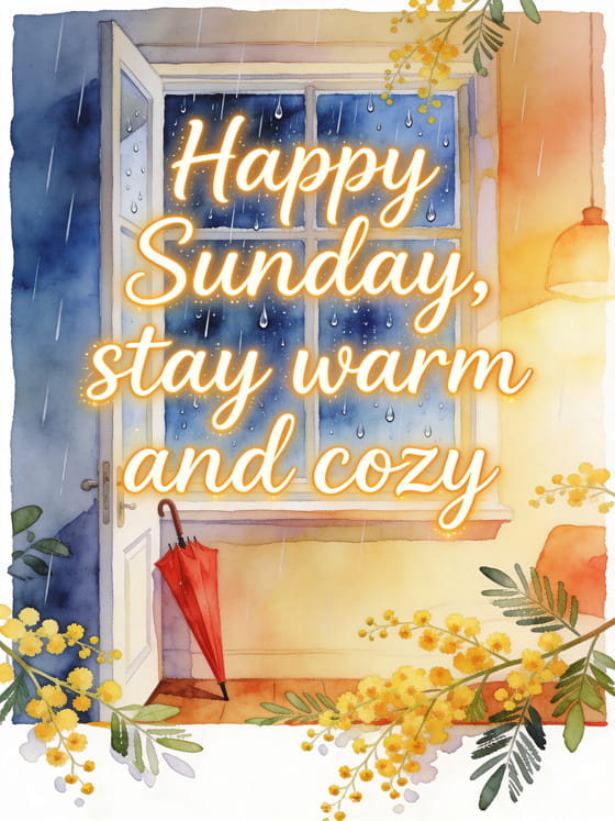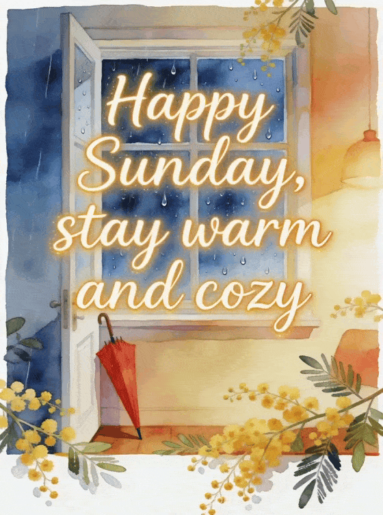 Happy Sunday, stay warm and cozy a comforting Sunday greeting for a rainy day