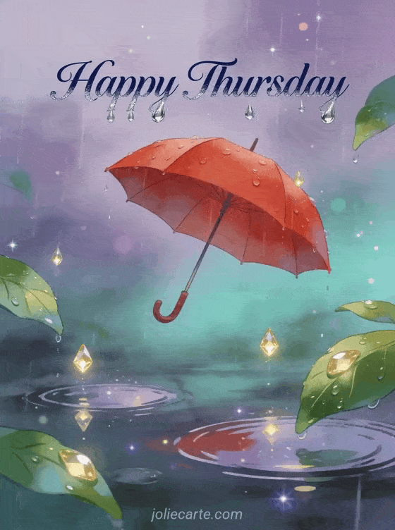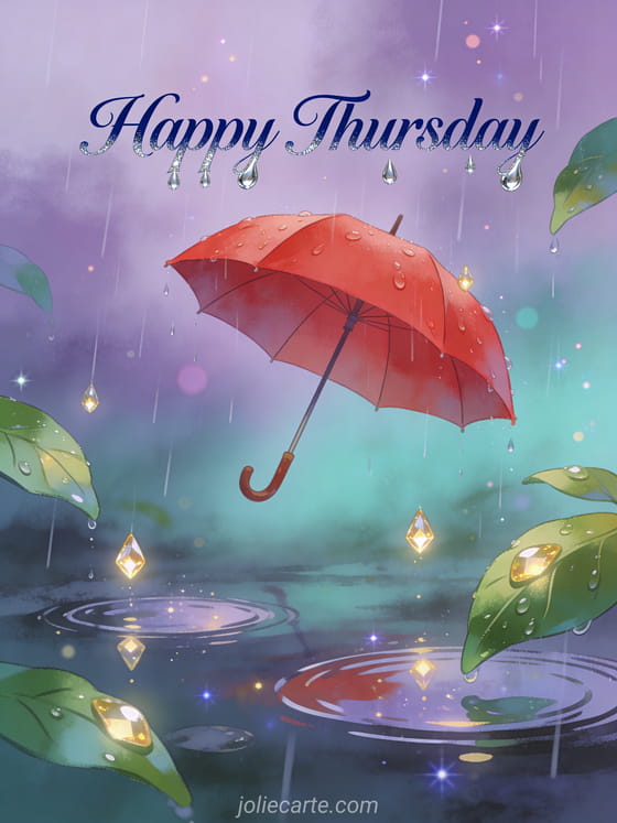 Share a warm happy Thursday wish with this magical card featuring a red umbrella among glistening raindrops. Discover also free image happy thursday kisses or happy thursday kisses for more Thursday inspiration.