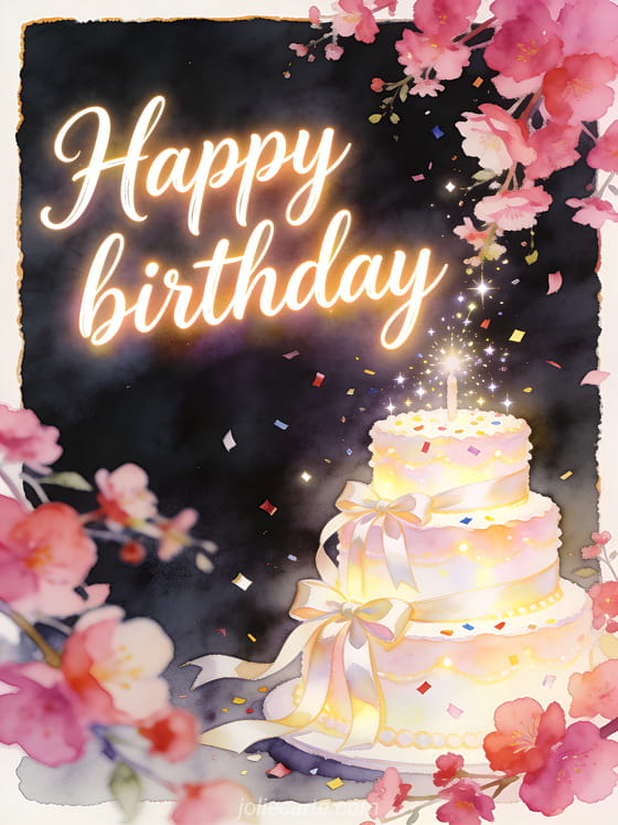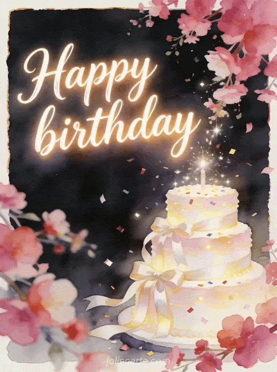 Share a joyful birthday card with ivory calligraphy, cascading fuchsia blossoms, a luminous tiered cake, satin ribbons, and sparkling confetti. The watercolor border and layered petals give this greeting a bright romantic feel. Discover also a happy birthday my love gif, romantic birthday couple, or birthday my darling.