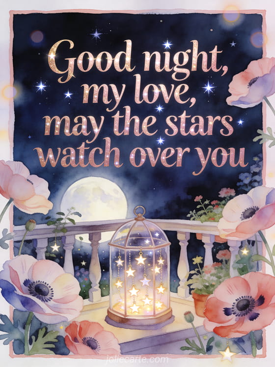 Wish good night, my love with a moonlit balcony garden, anemone petals and a glass terrarium filled with tiny glowing star charms. Share this romantic card and discover also a message to wish a female friend good night, a good night wishing card or a good night card.