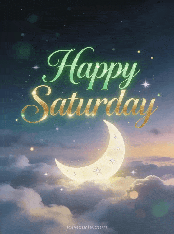 Share a peaceful happy Saturday greeting with a delicate crescent moon, stars and soft clouds in a twilight sky with gentle light. Discover also a happy Saturday coffee gif, gifs happy saturday or happy holy saturday.