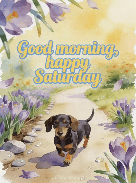 Send a saturday good morning gif with sunny yellow lettering, a dachshund trotting beside a garden path, fresh crocus petals and dew-bright stones in soft golden light. Discover also this happy saturday with the sun image, this happy Saturday kisses gif or this happy saturday my male friend image.