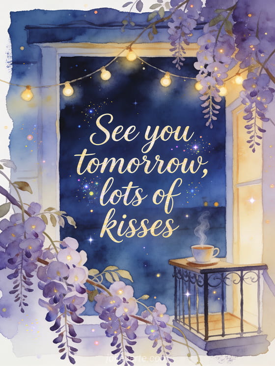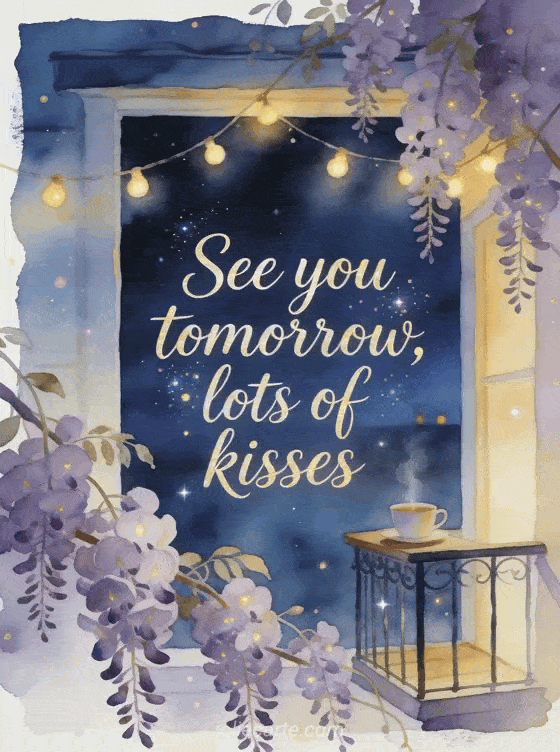 Share a cozy evening wish with elegant watercolor calligraphy, cascading wisteria, a small balcony, a steaming teacup, fairy lights, and blue-gold tones. Discover also a evening kisses see you tomorrow card, a big kisses see you tomorrow card, or a see you tomorrow kisses gif card.