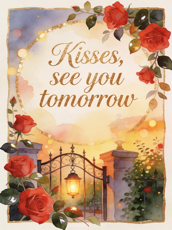 Share a soft goodnight promise with rounded watercolor script, red roses spilling past the border, glossy leaves, a cozy garden gate, and a glowing lantern. Discover also a kisses see you tomorrow card, a kisses see you tomorrow gifs card, or a see you tomorrow kisses images card.