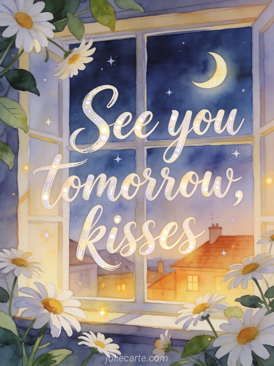 Send a gentle see you tomorrow message with watercolor daisies, a crescent moon, and warm rooftop lights. Discover also a hang in there see you tomorrow card, a hello see you tomorrow card, or a have a nice day see you tomorrow card.