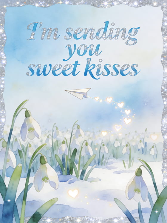Send sweet kisses with a small paper airplane carrying glowing hearts over a watercolor snowdrop meadow in clear tender light. Share this joyful card and discover also a rain of kisses gif, I'm sending you lots of kisses gif or a monkey kisses gif.